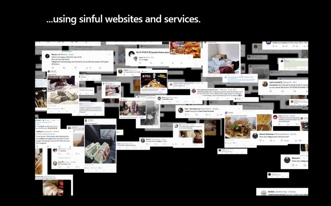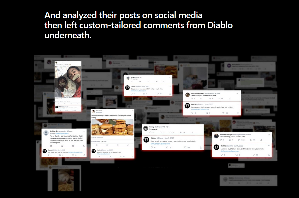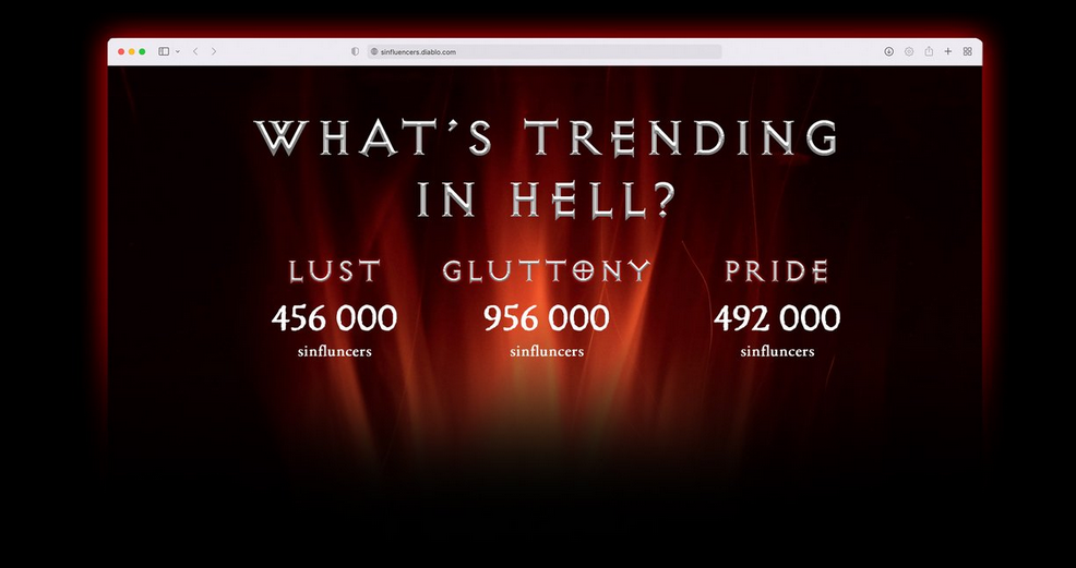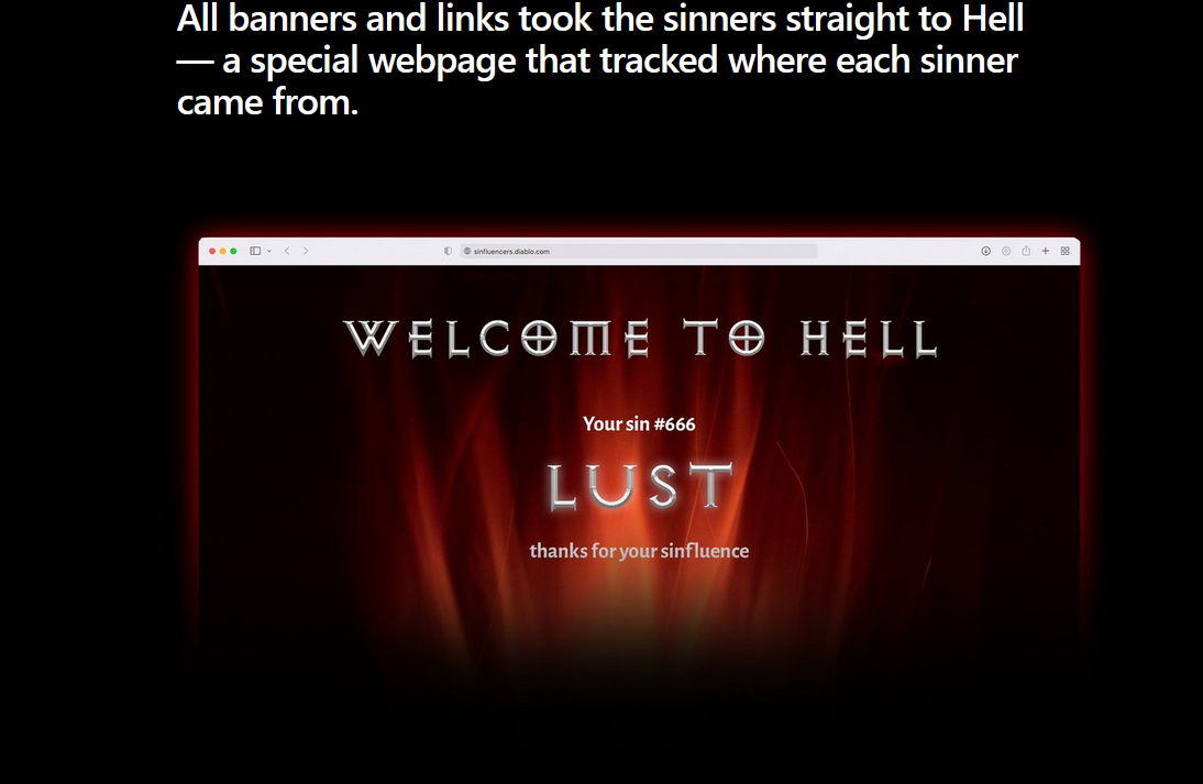 Идея. Отлавливать целевую аудиторию игры во время совершения «греха» на различных сайтах и ресурсах с помощью таргетированной рекламы. Все ссылки и баннеры ведут в «ад» — на специальную веб-страницу, которая распознает, откуда пришел тот или иной пользователь. В зависимости от места, где пользователь наткнулся на ссылку, ему присваивается грех.