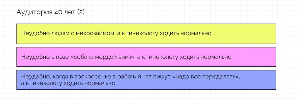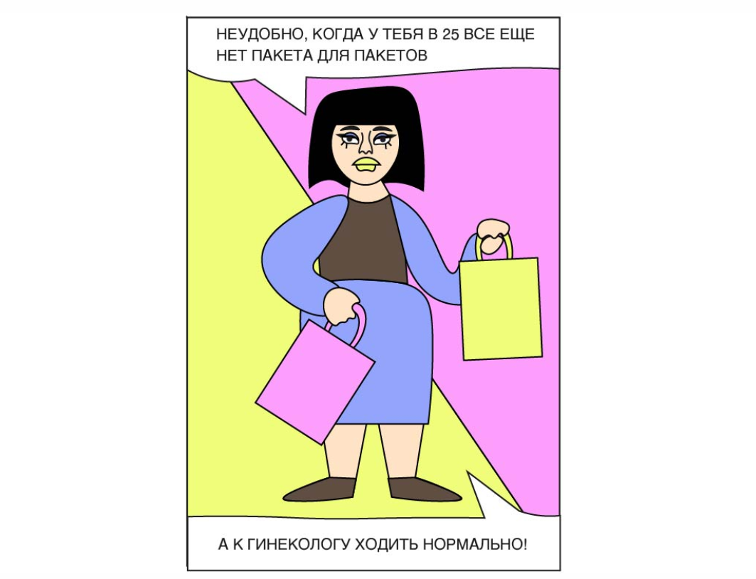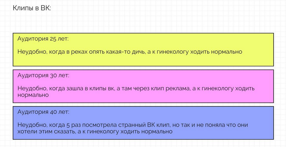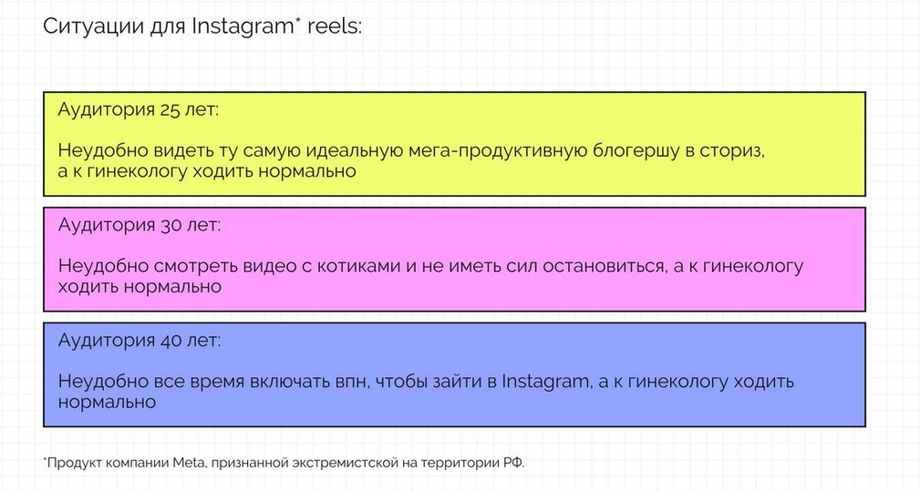 Принцип построения сценариев роликов. Сначала показываем комичную ситуацию, описанную в реплике. Например, «Неудобно ехать в офис после удаленки, а к гинекологу ходить нормально». Показываем, как героиня нехотя едет в офис. Затем кадр смещается на главную героиню крупным планом и она говорит финальную реплику. Такой принцип позволяет генерировать ролики практически бесконечно, главная задача лишь найти инсайт — неудобную вещь.