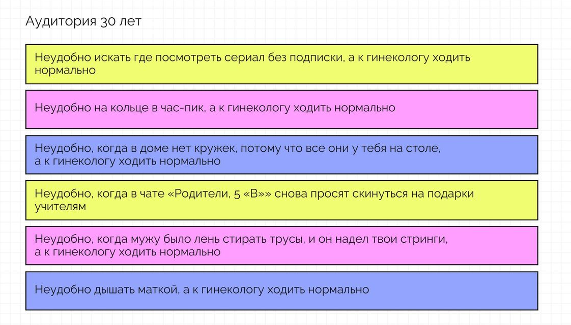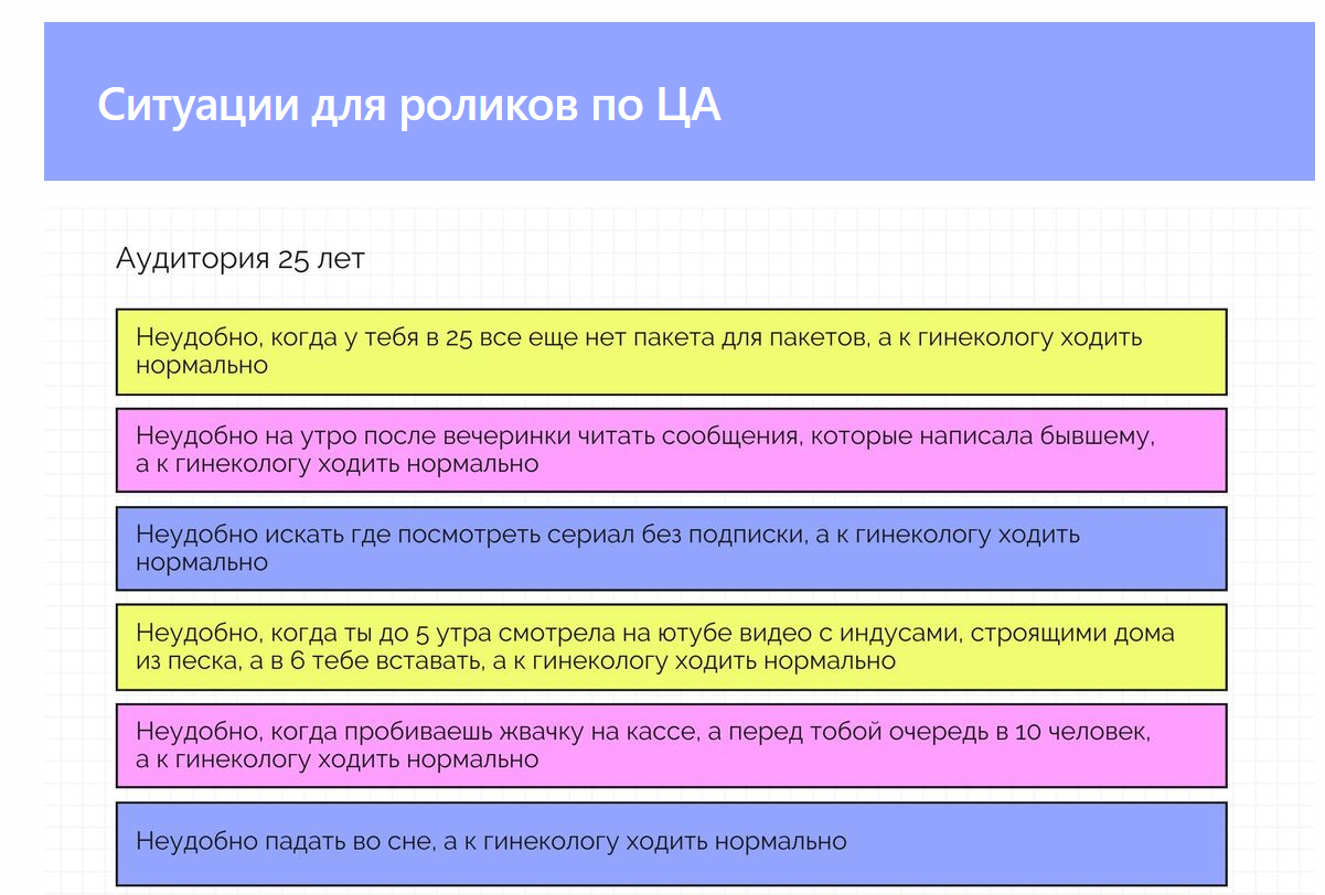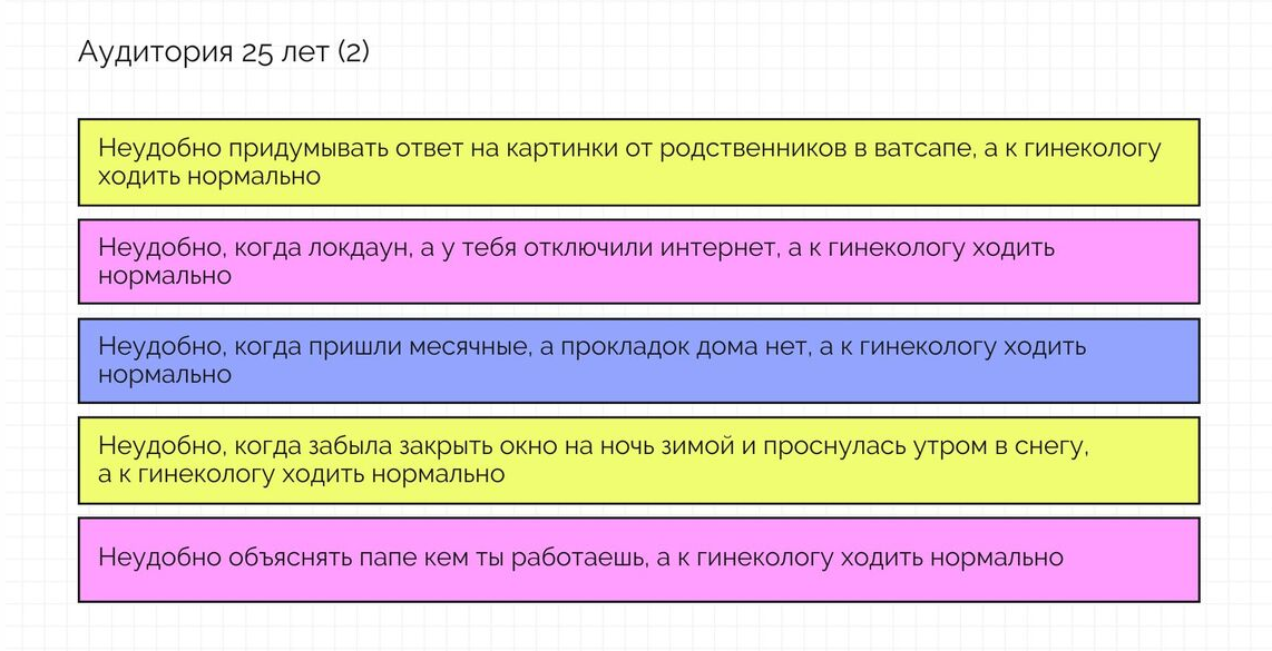 Инсайт и идея. Поход к гинекологу для многих женщин ассоциируется с чем-то неудобным. Однако в их жизни встречается гораздо больше вещей, которые действительно неудобны, в отличие от похода к гинекологу. Мы хотели показать целевой аудитории, с какими неудобствами они иногда сталкиваются. На их фоне поход к гинекологу не такая уж неприятная процедура.