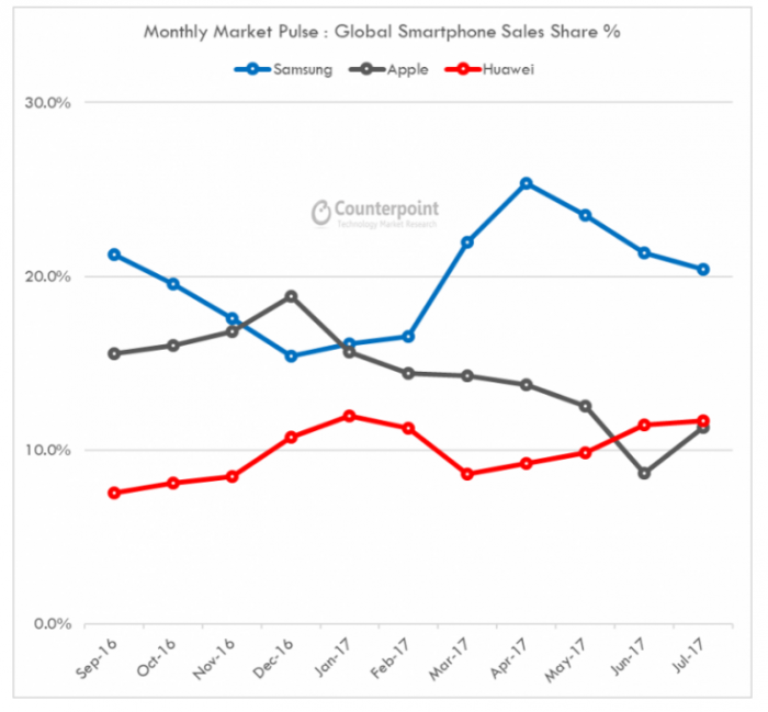 В июле 2017 года китайская компания Huawei заняла второе место по продажам смартфонов, обойдя Apple по этому показателю. Первое место в рейтинге традиционно занимает Samsung, сообщают аналитики Counterpoint`s Market Pulse.