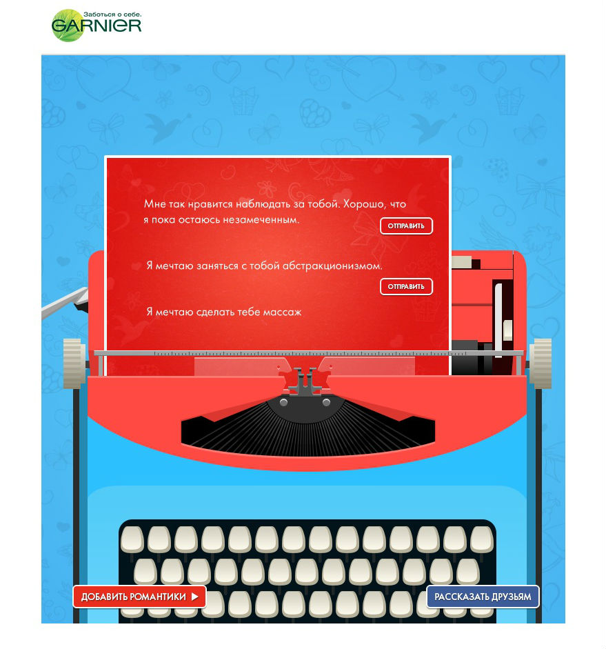 Агентство Hungry Boys вместе с брендом Garnier Чистая Кожа в День всех влюбленных порадовали пользователей приложением La machine du romance для Facebook, которое «облегчит жизнь нерешительным юношам и девушкам». Оно самостоятельно пишет комплименты – достаточно «стучать» по клавиатуре, после чего можно отправить признание другу в соцсетях.