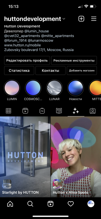 Для привлечения аудитории Hutton использует не только городскую, но и цифровую среду. Специально для девелопера молодая художница Алиса Спотс разработала AR-маску, обыгрывающую цвета и айдентику бренда. Творчество художницы созвучно характеру Hutton своей прозрачностью и многослойностью.