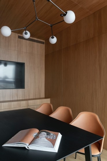 Посетители, зайдя в офис, невольно погружаются в эпоху, когда СССР открыл космос. Вместе с тем панорамный вид из окон, отделка из природных материалов и дизайнерская мебель отсылают к архитектуре жилого комплекса.