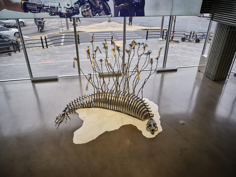 Это «аниматрон», соединяющий два разных мира — одушевленных существ и неодушевленных предметов. Работа представляет собой кинетическую скульптуру, которая напоминает морского котика с подобием вырастающих из него многосочлененных конечностей, двигающихся в такт истории, созданной художником. Она размывает границу между одушевленностью и механистичностью.