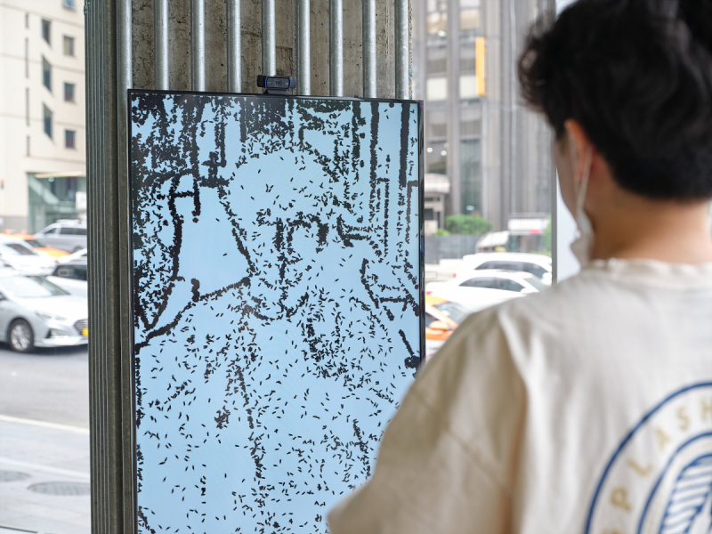 Интерактивная инсталляция с монитором, на котором при помощи множества движущихся точек, напоминающих мушиный рой, имитируются черты человека, стоящего напротив. Изображение постоянно меняется, создавая и разрушая образ наблюдателя, что является символической интерпретацией одержимости людей своей внешностью, ее мимолетностью и недолговечностью.