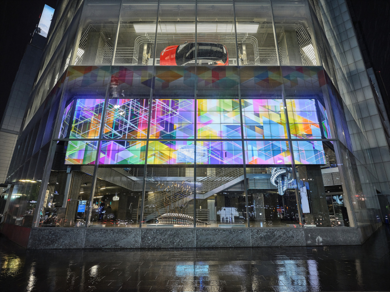 Генеративное видеополотно, которое транслируется на экране в автоматическом режиме: красочные вереницы кубов Некера и симметричных узоров за счет манипуляций с цветом и прозрачностью сливаются в трехмерные композиции, вырывающиеся за границы плоского экрана.