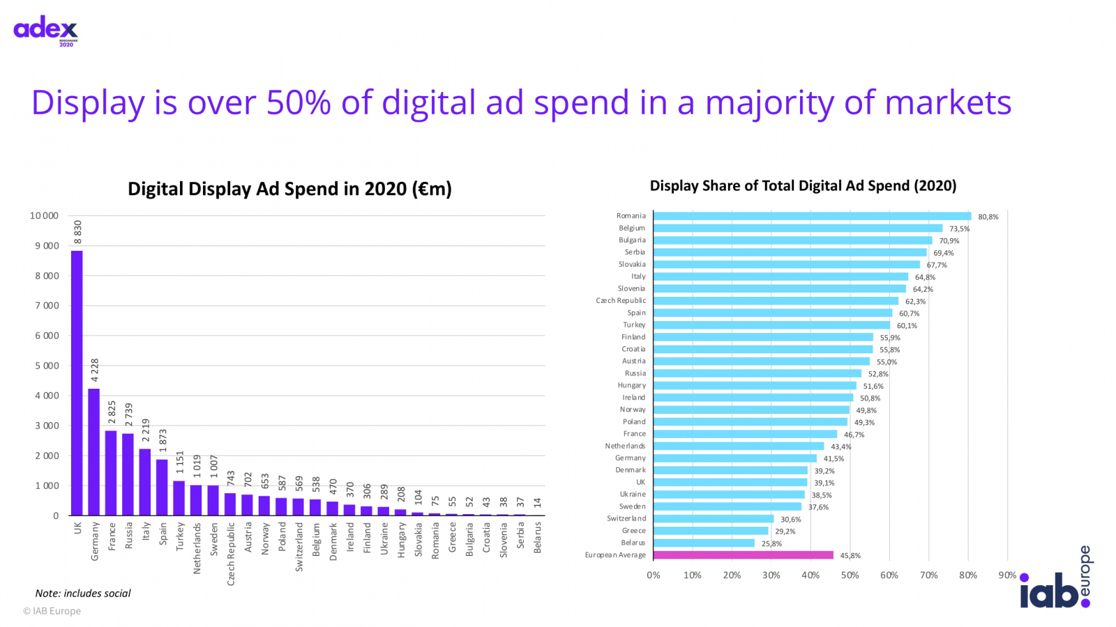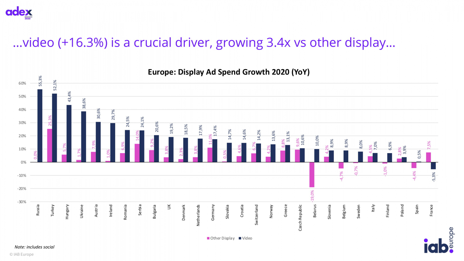 Главным драйвером роста дисплейной рекламы стало видео — расходы на формат увеличились на 16,3%, до €12,5 млрд с учетом соцсетей и на 10,1%, до €5,2 млрд не включая соцсети. Больше всего видеореклама выросла в России — на 55,3%, при этом остальная дисплейная реклама осталась на уровне 2019 года.