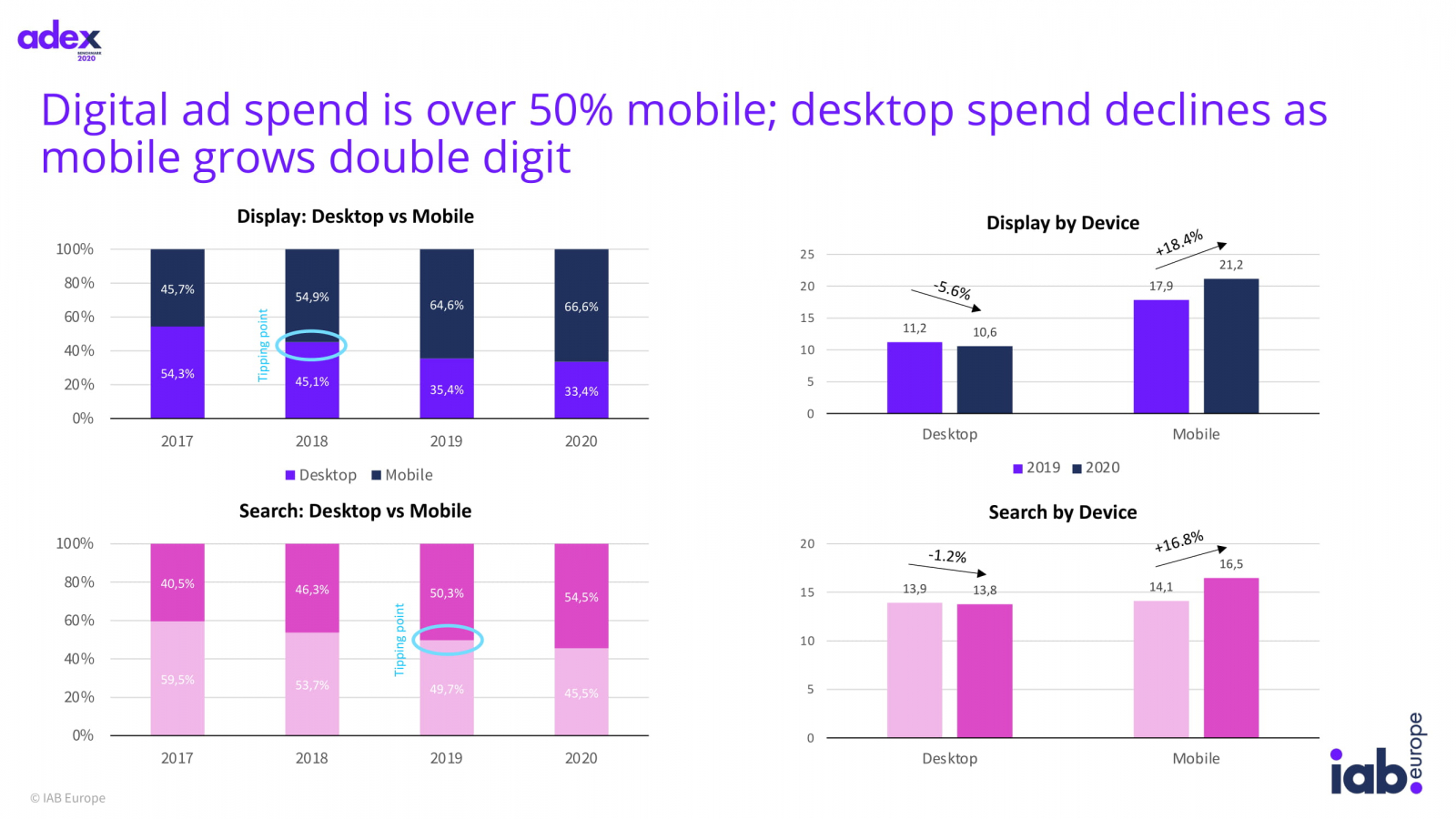 В платном поиске мобайл и десктоп сравнялись в 2019 году. В 2020-м мобильная реклама заняла 54,5% сегмента, прибавив 16,8% в денежном выражении, десктопная реклама потеряла 1,8% и заняла долю 45,5%.