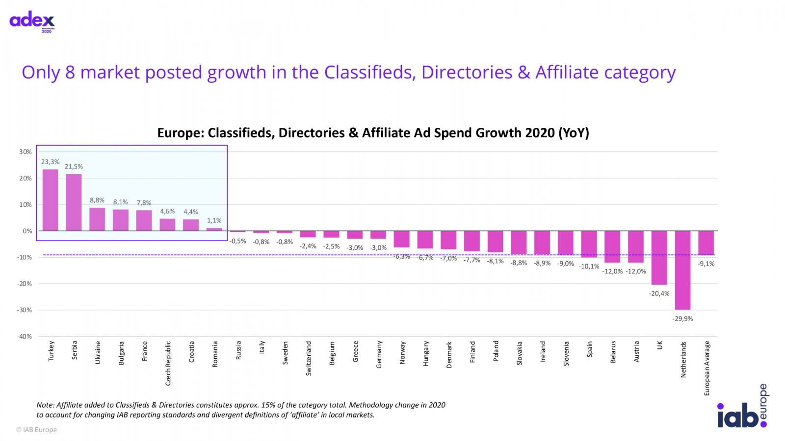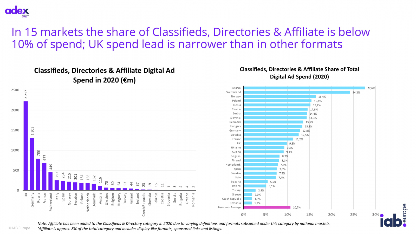 Классифайд, директории и партнерская реклама потеряли 9,1%. Эти категории выросли только на восьми рынках, все остальные продемонстрировали падение, в России оно составило 0,5% - это €788 млн по итогам 2020 года. Их доля в Европе составила 10,7%, в России этот показатель выше и достигает 15,2%.