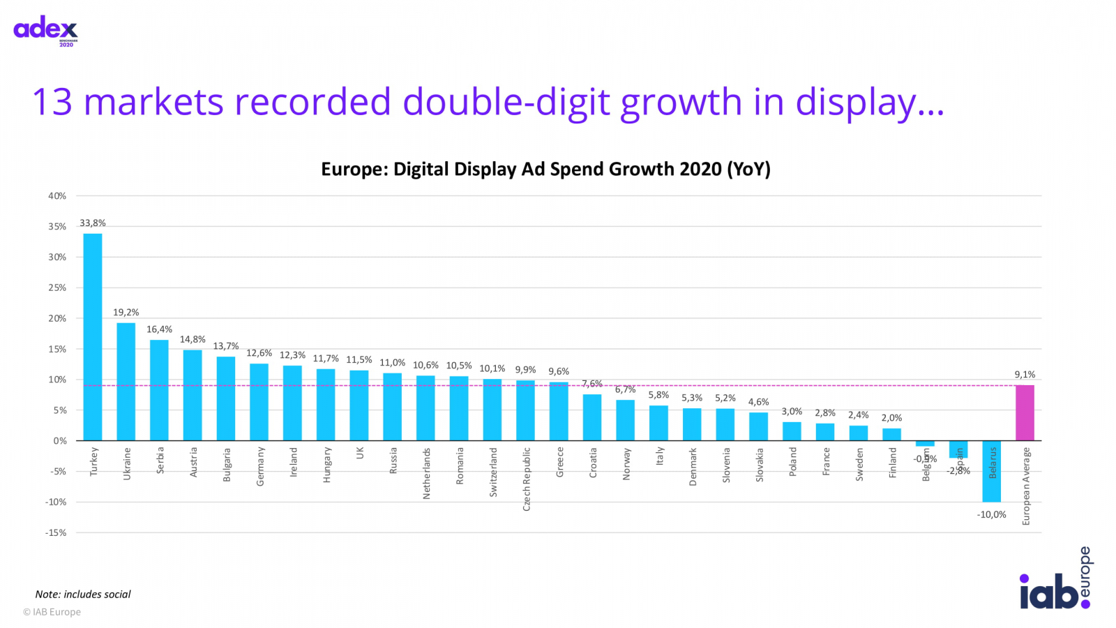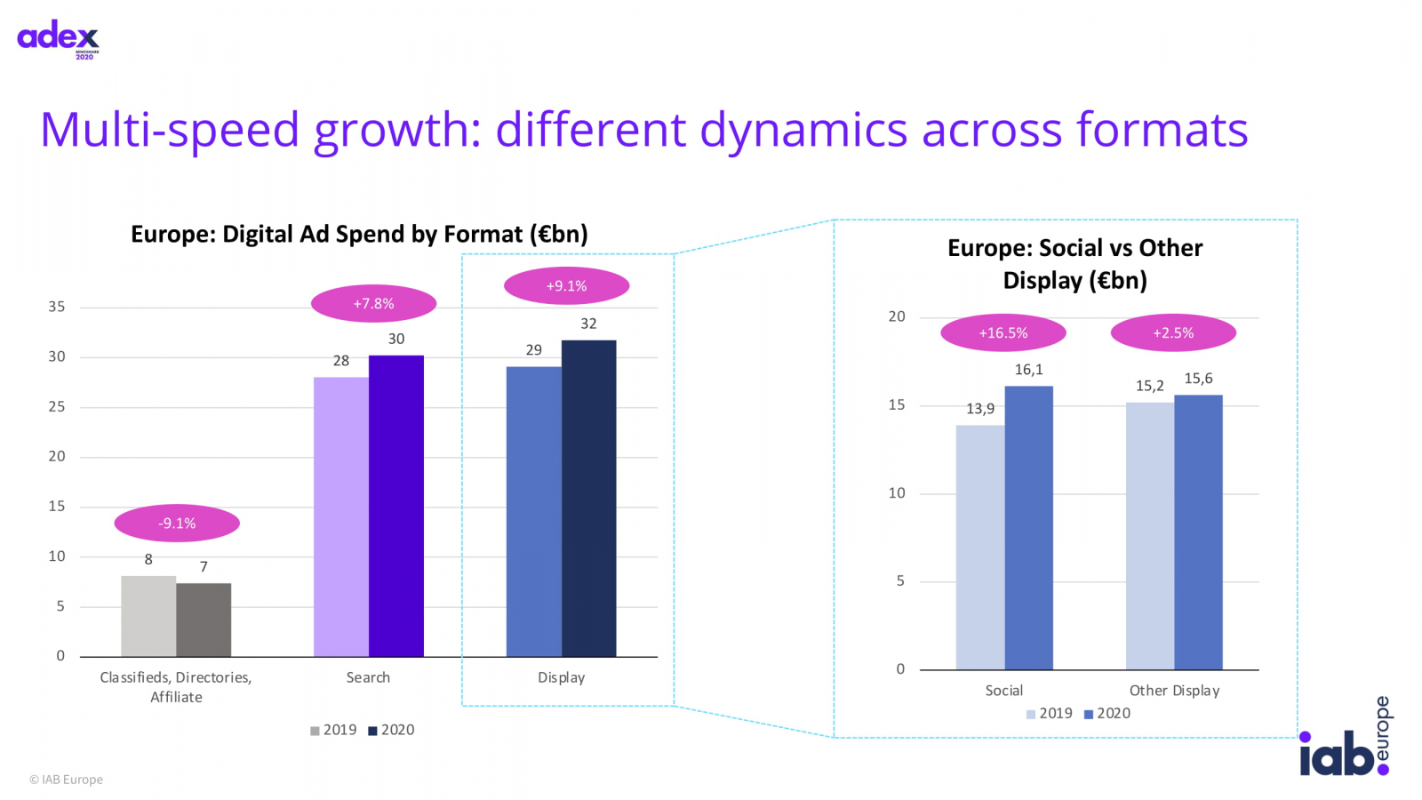 Дисплейная реклама превзошла средний показатель и выросла на 9,1%, за ней следует платный поиск (+7,8%). Классифайд, директории и партнерская реклама потеряли 9,1%. При этом в социальных сетях дисплейная реклама выросла на 16,5%, до €16,1 млрд.