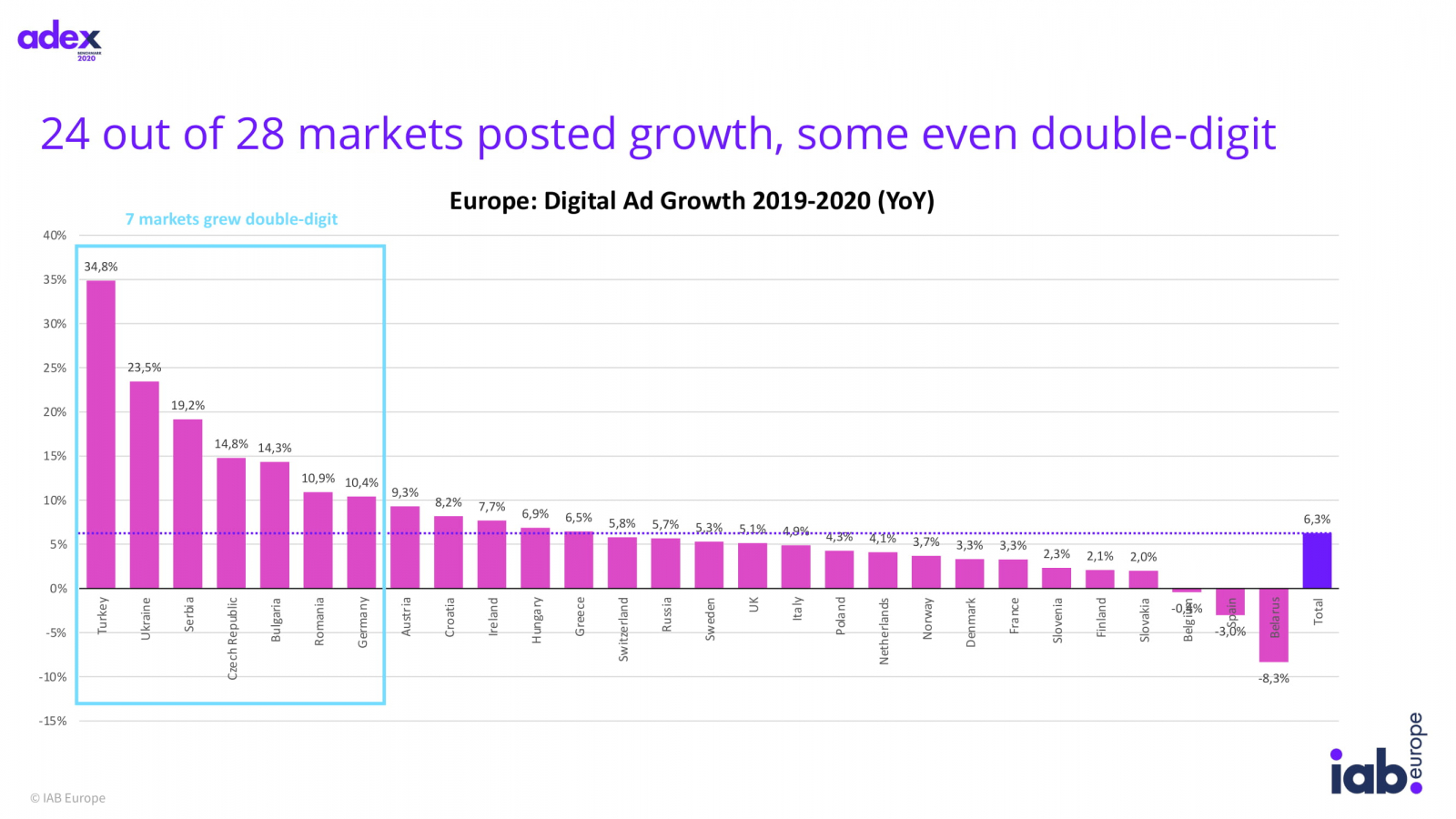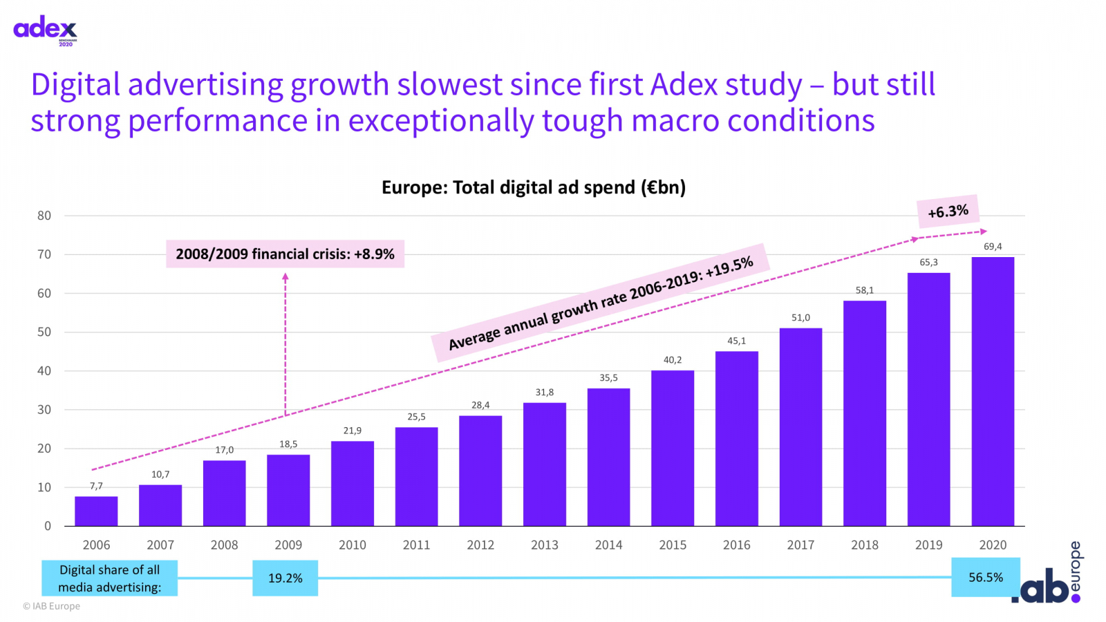 Эксперты IAB Europe представили полный отчет о расходах на digital-рекламу в Европе по итогам 2020 года. Исследование охватило 28 рынков, включая Россию. В Европе сегмент цифровой рекламы вырос на 6,3% и достиг €69 млрд — это самый медленный рост с начала наблюдений в 2006 году, всего за это время объем digital-сегмента увеличился на 19,5%.