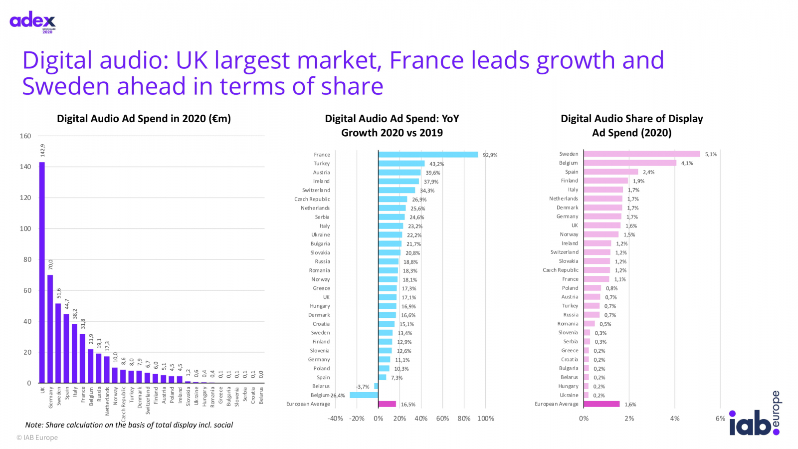 Расходы на digital-аудио в Европе составили чуть более €500 млн — это на 16,5% больше год к году. Этот показатель включает онлайн-радио, музыкальные стриминговые сервисы, подкасты и голосовых ассистентов. В России рекламодатели потратили на сегмент аудио €19,1 млн, что на 18,8% больше показателей 2019 года. Доля аудио в общем объеме расходов на дисплейную рекламу составила 1,6% (включая соцсети). В России доля digital-аудио — 0,7%.