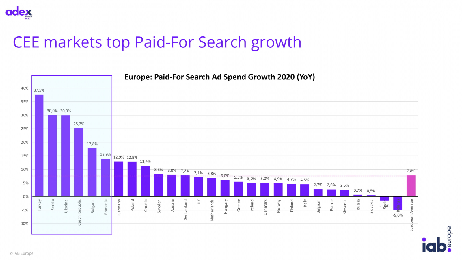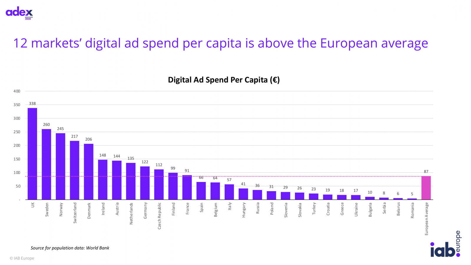 В России расходы на интернет-рекламу увеличились на 5,8%, до €5,183 млрд — это четвертый показатель после Великобритании, Германии и Франции. Траты на digital на душу населения составили €35,9 при среднеевропейском показателе €87.
