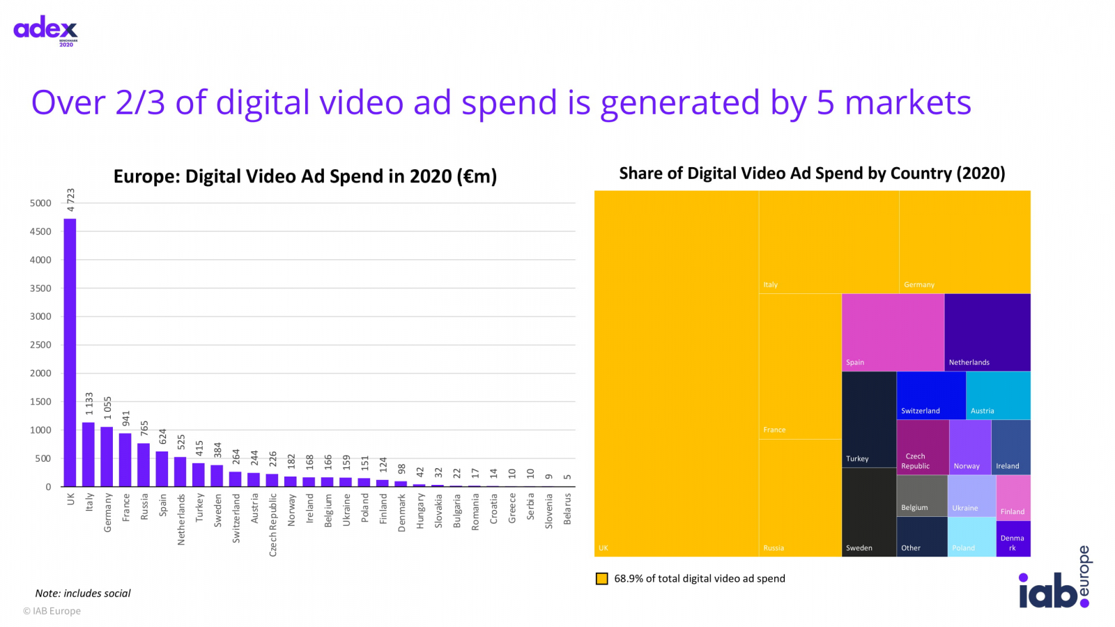 Доля видео в дисплейной рекламе на российском рынке составила 27,9%, при этом средний показатель в Европе — 39,4%. Всего российские рекламодатели потратили на digital-видео €765 млн. При этом первые пять стран по этому показателю — Великобритания, Италия, Германия, Франция и Россия, — заняли 2/3 всего европейского рынка видеорекламы.