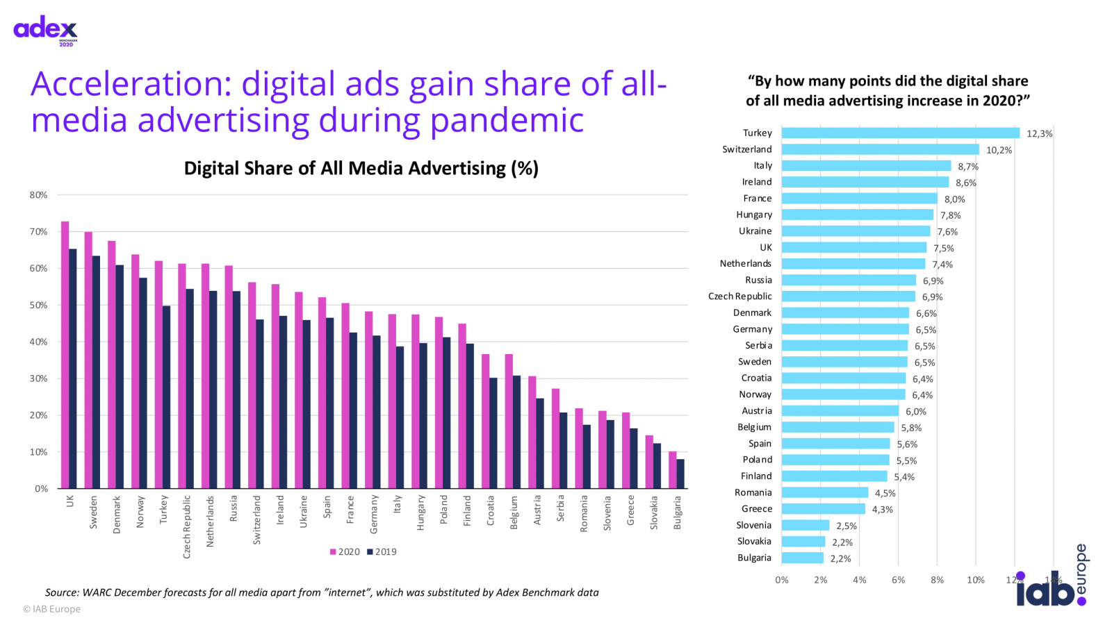 Доля digital выросла на всех исследуемых рынках, в 13 из 28 стран она превысила 50%, включая Россию, где доля интернет-рекламы выросла на 6,9 процентных пунктов и составила более 60% от общего объема рекламного рынка. В среднем на цифровую рекламу приходится 56,5% медиабюджетов по сравнению с 19,2% в 2009 году.