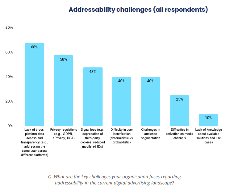Главной проблемой отрасли 68% участников назвали кроссплатформенный доступ к данным, 58% указали на ограничения, связанные с правилами конфиденциальности, а 48% — на потерю сигналов после отказа от cookie.