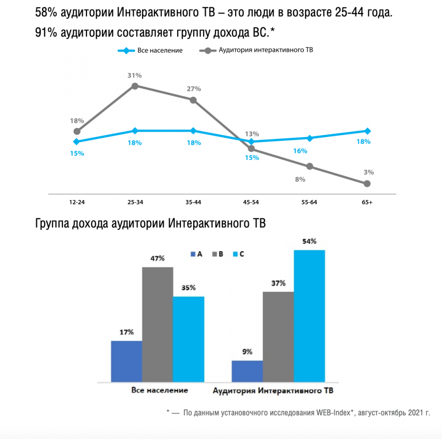 При этом для рекламодателей аудитория интерактивного ТВ самая привлекательная. По данным WEB-Index за август-октябрь 2021 года, возраст 58% зрителей интерактивного ТВ составил 25−44 года. При этом 91% аудитории имеют средний или выше среднего уровень дохода.