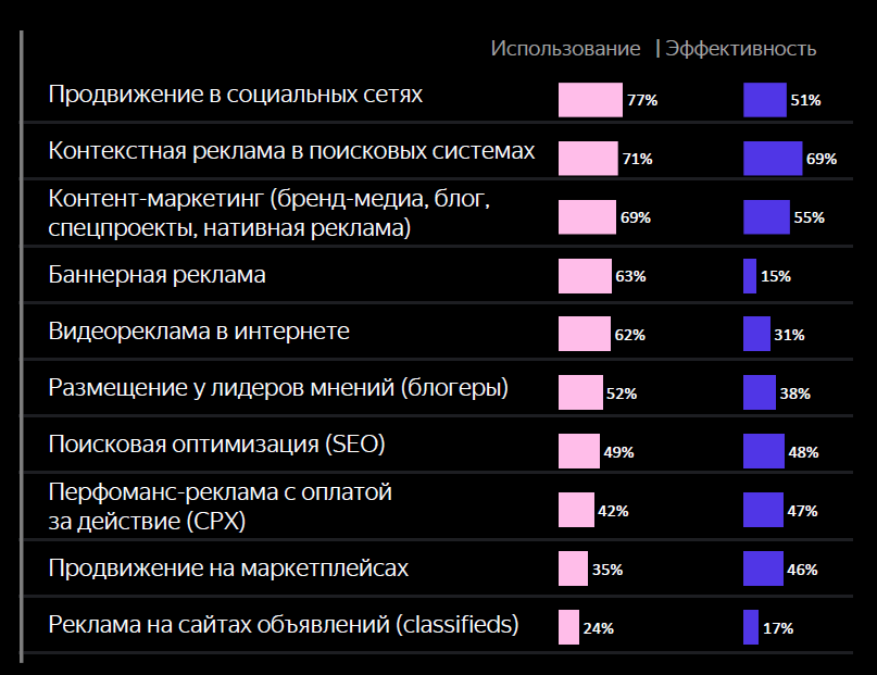 Согласно данным исследования, которое проводилось с февраля по март 2022 года, контент-маркетинг относится к основным типам продвижения по частоте использования и по эффективности — так считают 69 и 55% респондентов соответственно. По эффективности контент-маркетинг находится наравне с продвижением в социальных сетях (51%) и уступает только контекстной рекламе (69%).