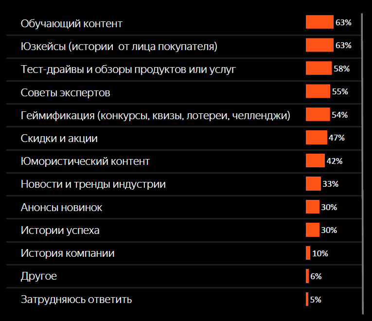 В топе обучающий контент и разные форматы юзкейсов (истории от лица покупателей) — о них при опросе говорили по 63% респонденов. При этом не очень популярны привычные бизнесу истории успеха и анонсы новинок — данные форматы назвали по 30% опрошенных.