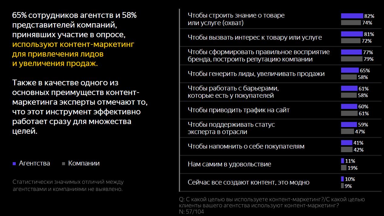 Аналитики отмечают, что 65% сотрудников агентств и 58% представителей компаний, принявших участие в опросе, используют контент-маркетинг для привлечения лидов и увеличения продаж. В качестве одного из основных преимуществ контент-маркетинга опрошенные эксперты отмечают эффективность его работы сразу для множества целей.