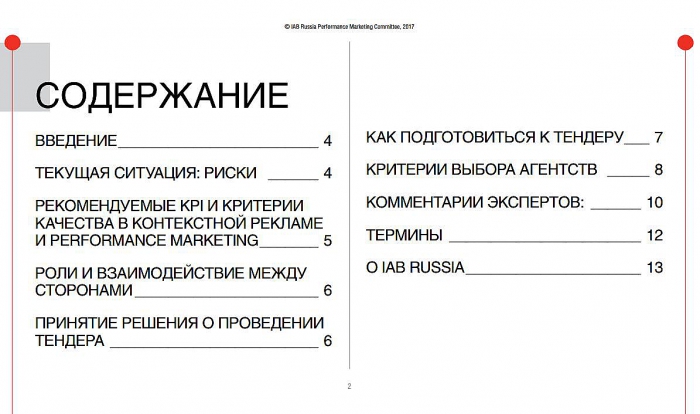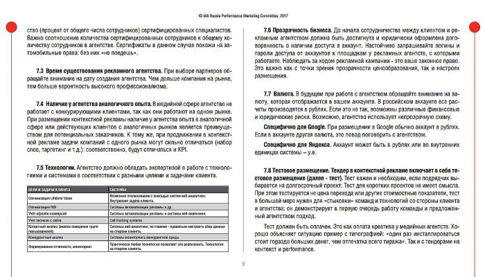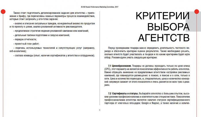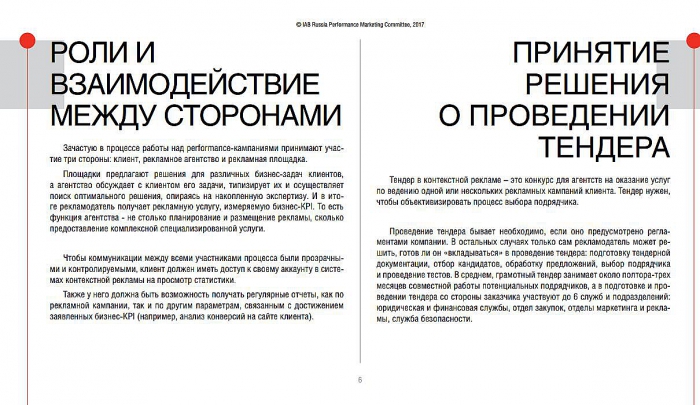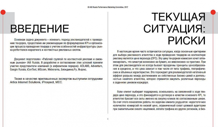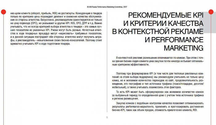 Главная цель документа – изменить подход рекламодателей к проведению тендеров, предоставив им рекомендации по формулировке KPI. Как поясняют в Комитете, Основным критерием для выбора рекламного агентства в ходе проведения тендеров на контекстную рекламу часто является цена перехода, которую, по сути, невозможно оптимизировать. При этом для рекламодателя принципы ценообразования в аукционе не всегда прозрачны, а цена, между тем, зависит и от типа трафика, и от географических и объемных характеристик. Это порождает негативный эффект разрыва между достижением собственных бизнес-целей рекламодателей и деятельностью нанятого агентства, которое стремится закупить различные переходы в заданном ценовом коридоре.