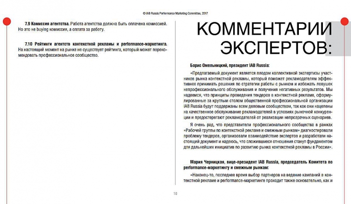 Борис Омельницкий, президент IAB Russia: «Предлагаемый документ является плодом коллективной экспертизы участников рынка контекстной рекламы, который поможет рекламодателям эффективнее принимать решения по стратегии работы с рынком и избежать ловушек непрофессионального обслуживания и получения негативных результатов. Мы надеемся, что принципы проведения тендеров в контекстной рекламе, сформулированные за круглым столом общественной профессиональной организации IAB Russia будут поддержаны всем деловым сообществом, так как они нацелены на качественное обслуживание рекламодателей в условиях рыночной конкуренции и предостерегают рекламодателей от реализации непрозрачных сценариев».