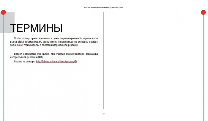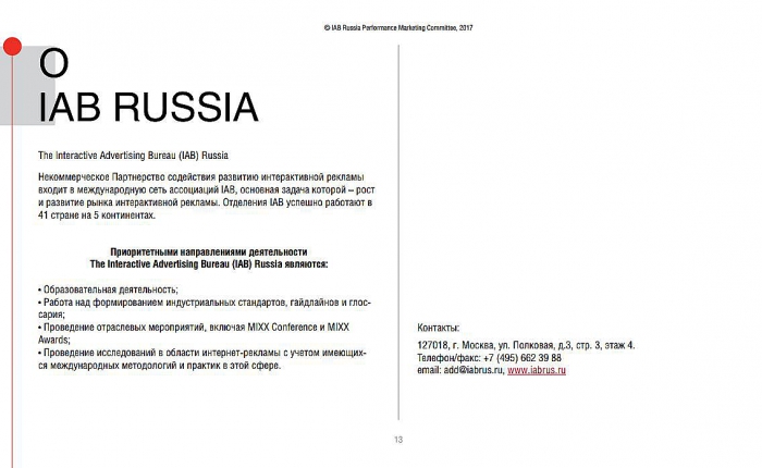 Документ подготовлен «Рабочей группой по контекстной рекламе и смежным рынкам» IAB Russia. В разработке и согласовании условий приняли участие представители компаний: ADLABS, Adventum, Google Russia, iConText, LaModa, MGcom, Weborama, Блондинка.Ру, Яндекс.