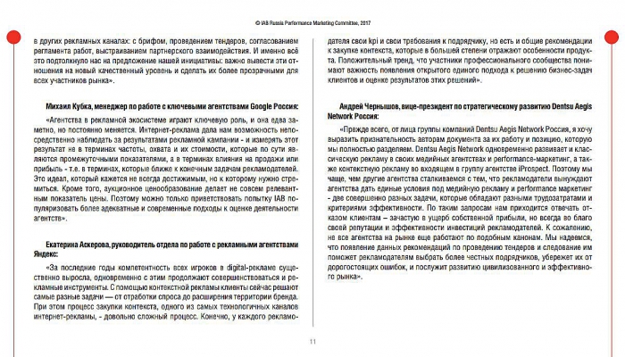 Мария Черницкая, вице-президент IAB Russia, председатель Комитета по performance-маркетингу и смежным рынкам: «Наконец-то, последнее время выбор партнеров на ведение кампаний в контекстной рекламе и performance-маркетинге проходит также основательно, как и в других рекламных каналах: с брифом, проведением тендеров, согласованием регламента работ, выстраиванием партнерского взаимодействия. И именно всё это подтолкнуло нас на предложение нашей инициативы: важно вывести эти отношения на новый качественный уровень и сделать их более прозрачными для всех участников рынка».