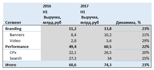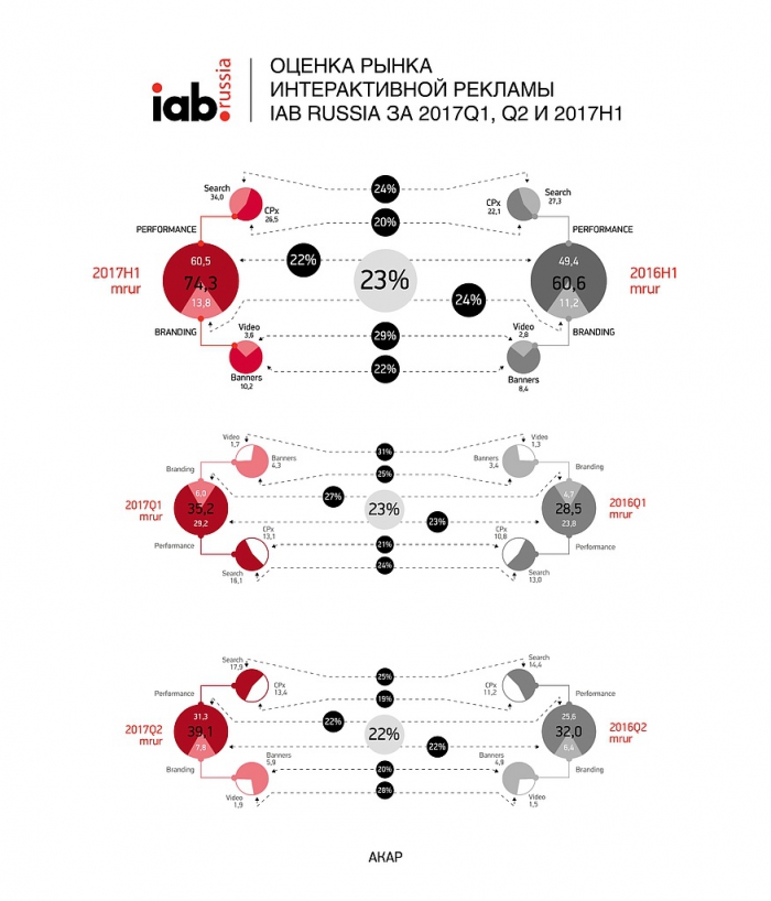 По итогам исследования Ассоциации Коммуникационных Агентств России за первое полугодие 2017 суммарный объем рекламы в средствах ее распространения за вычетом НДС превысил отметку в 190 млрд рублей, что на 14% больше, чем в соответствующем периоде прошлого года. Сегмент рынка интернет-рекламы оценили эксперты IAB Russia в 74 млрд рублей, динамика роста по сравнению с аналогичным периодом прошлого года составила 23%.