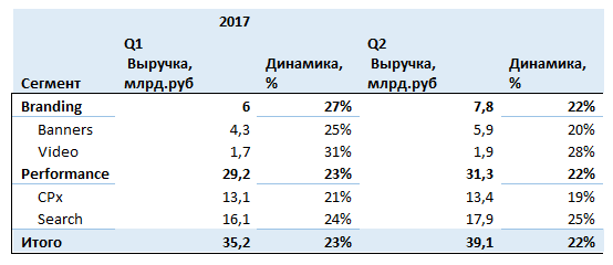 Второй сегмент - Branding включает доходы от продаж рекламы по модели «оплата за выход рекламного сообщения», использующей такие имидж-инструменты, как баннерые позиции и растущий сегмент видеорекламы. Рост cегмента Branding обусловлен появлением более эффективных форматов видеорекламы в социльных сетях и ростом мобильного сегмента, по мнению Беляева.
