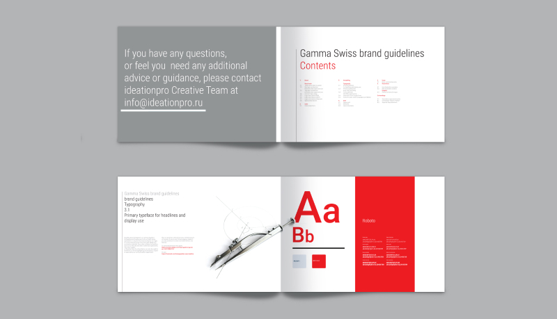 Ну и, конечно, основную эстетику нам задал логотип Gammaswiss. Чёткие графичные линии со считывающимся знаком латинской буквы гамма, завязаны на красном цвете, который присутствует здесь абсолютно неслучайно. Это цвет швейцарского флага, и он изначально был в техническом задании как база. Оттолкнувшись от логотипа и шрифта, постепенно удалось создать полный визуальный язык, понятный европейскому клиенту.