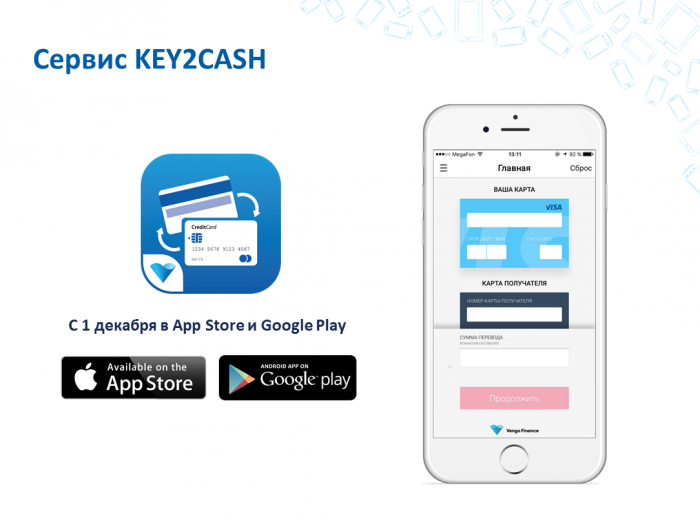 Еще одним приоритетным направлением Vengo Group был назван сегмент мобильных платежей. Игорь Ерёмин анонсировал первый продукт в рамках проекта Vengo Finance – сервис Key2сash, предназначенный для мгновенного перевода денежных средств (P2P) с карты на карту. Мобильное приложение будет доступно в App Store и Google Play уже с 1 декабря текущего года, а для рекламной поддержки будут задействованы все крупнейшие федеральные СМИ, использующие технологии iVengo Mobile. Также Vengo Finance будет развивать направление интернет-эквайринга совместно с банками-партнерами и предложит ряд решений по мобильным платежам в сфере ЖКХ в 2016 году.