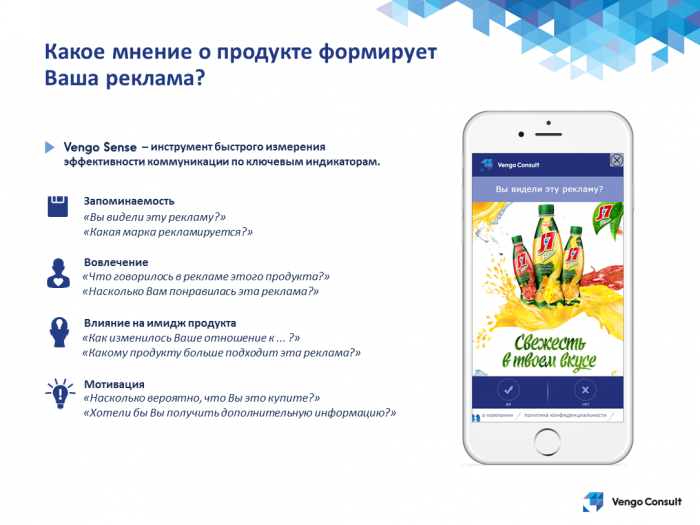 Vengo Consult – инновационная платформа для проведения мобильных опросов и изучения общественного мнения. Социально-демографические данные (пол, возраст, социальное положение и др.), полученные в результате опросов, будут использоваться для формирования аудиторных сегментов и обогащения DMP медийной рекламы iVengo Mobile. Один из инструментов платформы, Vengo Sense, позволит рекламодателям проводить оценку эффективности рекламных кампаний с помощью мобильных опросов. Кроме того, Vengo Consult будет служить SaaS-решением для крупных исследовательских организаций. Как отмечает менеджмент компании, уже были проведены переговоры с ведущими игроками рынка исследований (ВЦИОМ, ФОМ, Левада-Центр, TNS, GFK и др.) и проводятся тестовые опросы.
