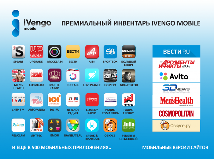 Месяц назад мы получили двухлетний эксклюзив на всю линейку мобильных приложений радиостанций холдинга Проф-Медиа (Радио ENERGY, “Юмор FM”, Онлайн Радио 101.ru, Relax FM, Comedy Radio, СИТИ-FM, Радио Romantika, и др. - пр. ред), мы подписали соглашение с кулинарным приложением Юлии Высоцкой, там очень хороший трафик, который может быть интересен пищевым брендам и производителям бытовой техники. Мы интегрировались в мобильные версии таких сайтов, как Aif.ru, Ovkuse.ru, в приложения Москва24, Литрес, Вести.ru и Sportbox.ru, мы размещаем рекламу в мобильных приложениях журналов Upgrade и Spears, а также ведем активные переговоры с известными глянцевыми изданиями. В нашей сети есть TopFace и LovePlanet, Translate.ru и Justlady.ru . Вообще их сотни, все не перечислишь.