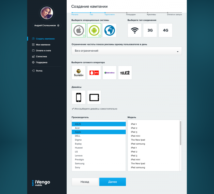 У нас 10 видов таргетингов. Их долго перечислять, но, как пример, мы можем показывать рекламу с 19 до 20 вечера одному уникальному пользователю в день, который является абонентом МТС или сидит дома через Wi-Fi и находится в Санкт-Петербурге в километре от ресторана Subway, также у него iPhone 5, а реклама идет только в приложении Аргументы и Факты. Помню, как-то к нам приходил бриф от сети ресторанов, для которой рекламу нужно было показывать в радиусе одного километра вокруг каждой из 700 ее точек по всей России.