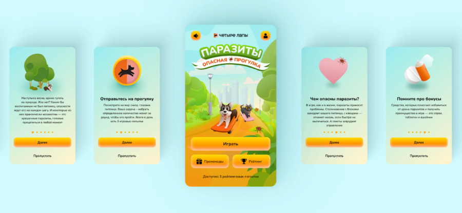 Во время онбординга пользователю мягко напоминают, какие опасности подстерегают питомцев на улице с приходом весны. Варианты решения проблем в виде ошейников или спреев нативно включены в сюжет — они представлены как бустеры, которые лечат персонажа или повышают его стойкость.