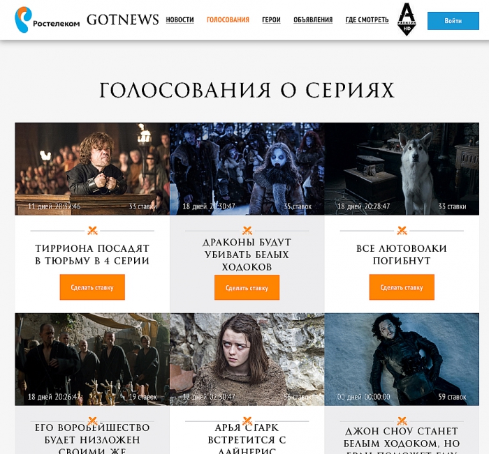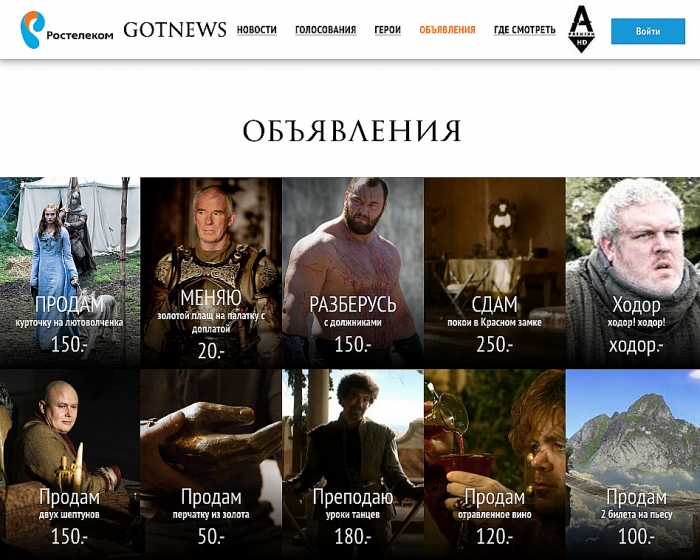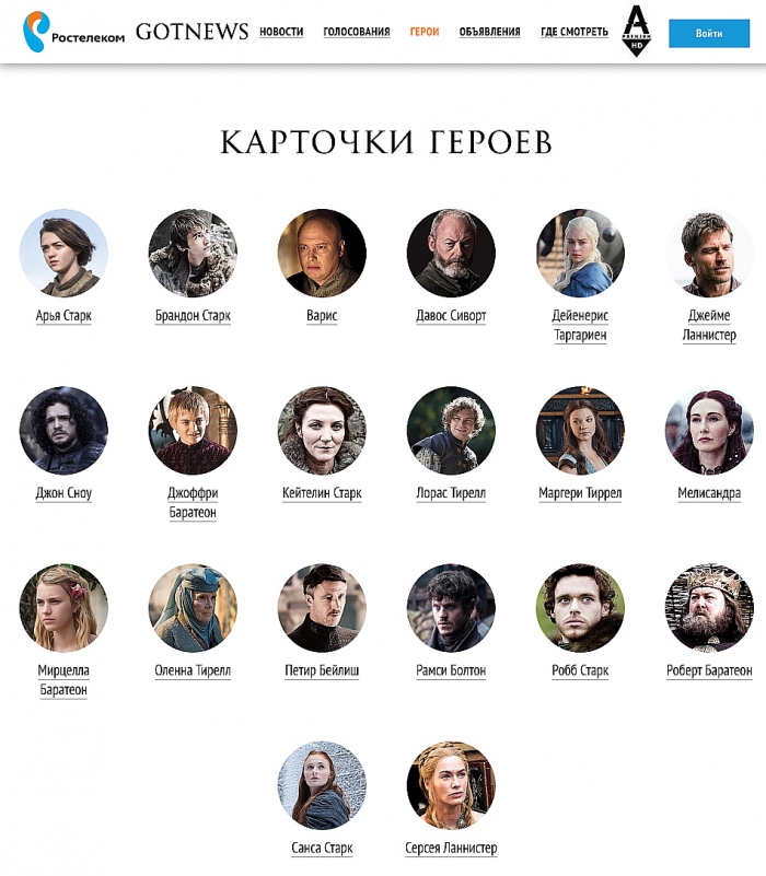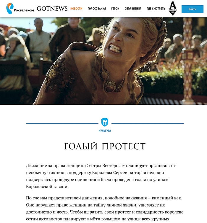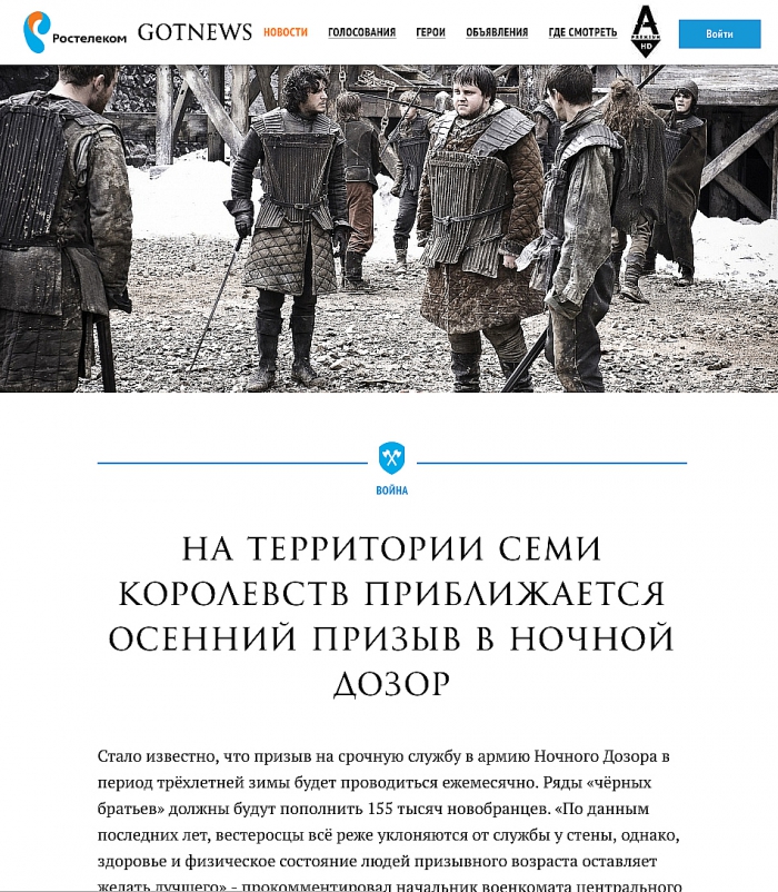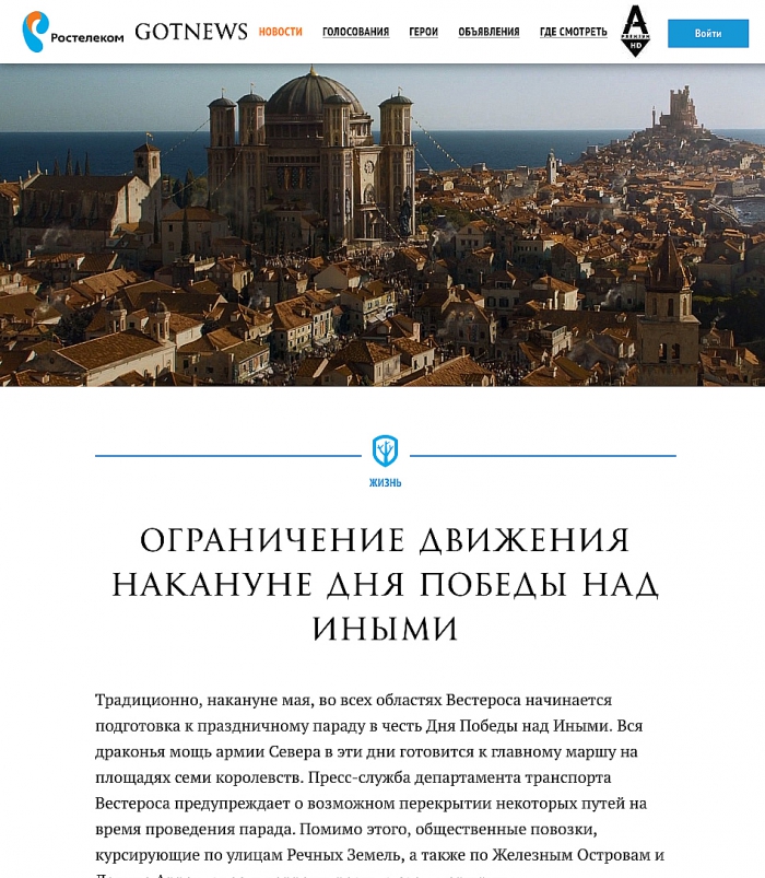 Самый популярный сериал 2015 года - "Игра престолов" - теперь получил собственный информационный ресурс в Рунете, освещающий различные аспекты жизни в Семи королевствах. Таким необычным образом решил продвигаться сервис видеопроката «Интерактивного ТВ Ростелеком».