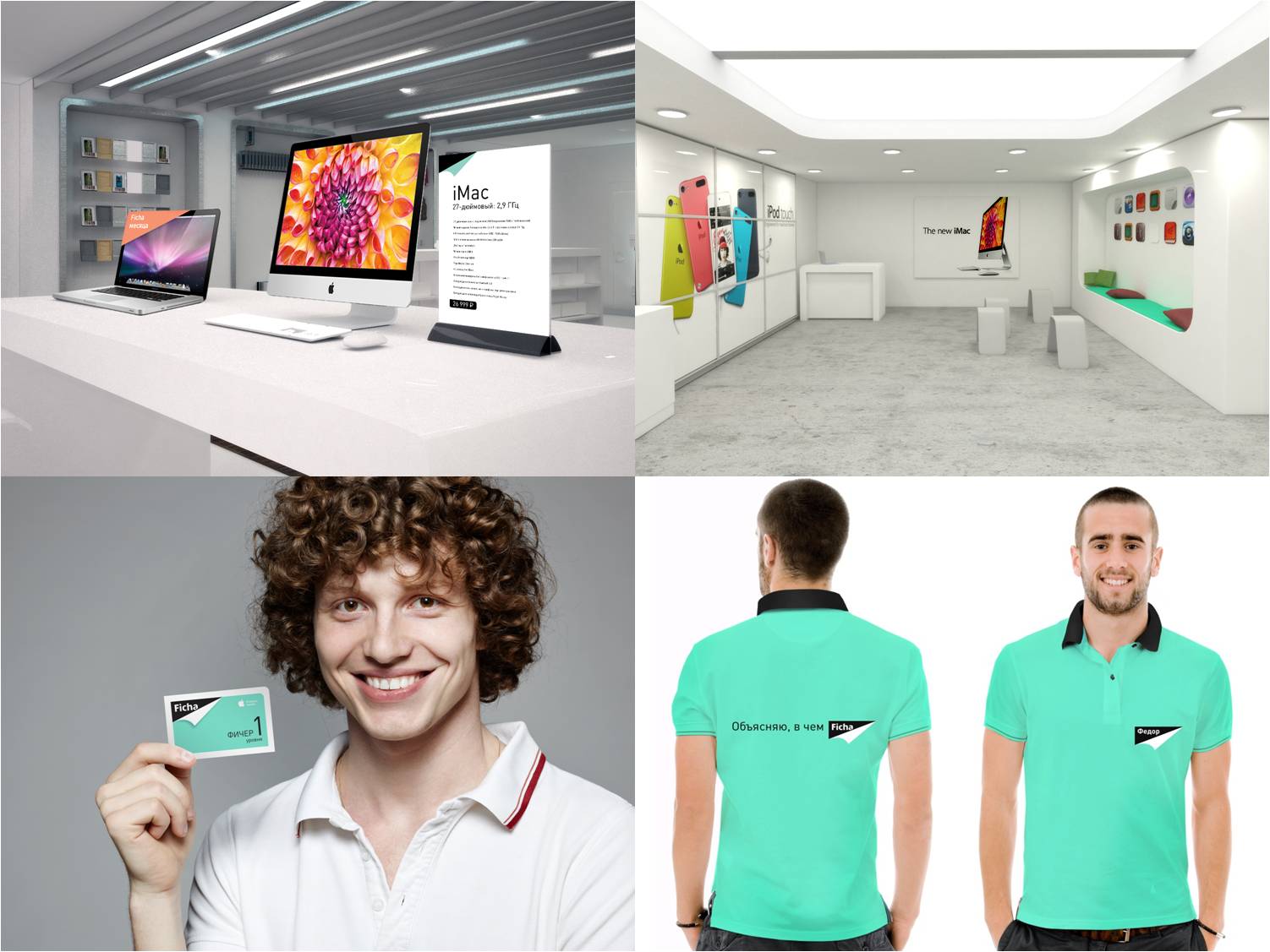 Мы стремились продемонстрировать второй слой, бэкстейдж техники Apple. То, что скрыто от глаз, хотя и является гордостью компании ничуть не меньше, чем общеизвестные атрибуты. Ficha – это помощник и проводник в мир нового, с которым всегда интересно. Узнаваемая атрибутика компании – надписи на упаковке и футболках, фирменные карты «Фичер», фирменный стиль, стиль общения продавцов, представительства в социальных и ритейл-сетях – все формирует запоминающийся образ бренда.