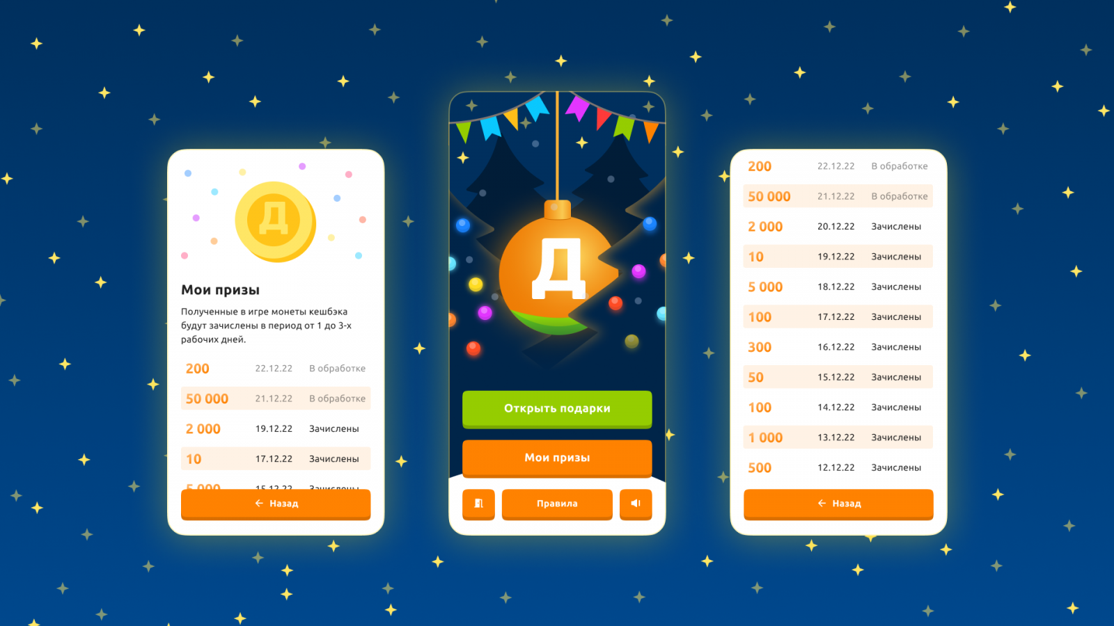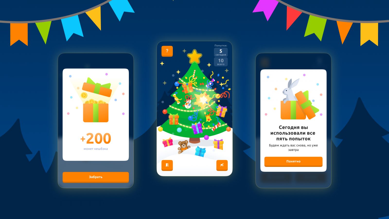 Так как активация выпадала на предновогодний период и праздники, выбрали соответствующий визуальный и креативный подход игры: все задания были тематическими, находились на «ёлке», а сами карточки заданий напоминали новогодние открытки. Концепцию и цвета взяли у бренда, чтобы органично вписать геймификацию во внутреннее наполнение приложения.