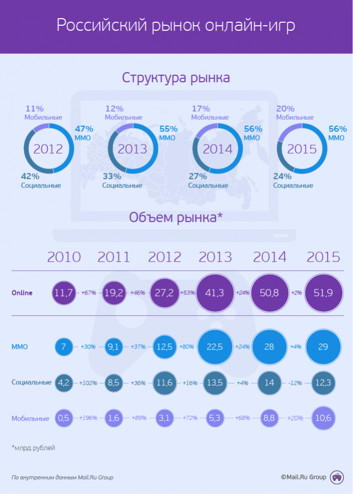 Наибольшее количество онлайн-игроков по-прежнему проводит время за многопользовательскими играми (MMO). При этом уже третий год их доля сохраняется приблизительно на одном уровне – 55–56%. Объем рынка MMO-игр в 2015 году составил 29 млрд рублей, что на 4% больше по сравнению с 2014-м.
