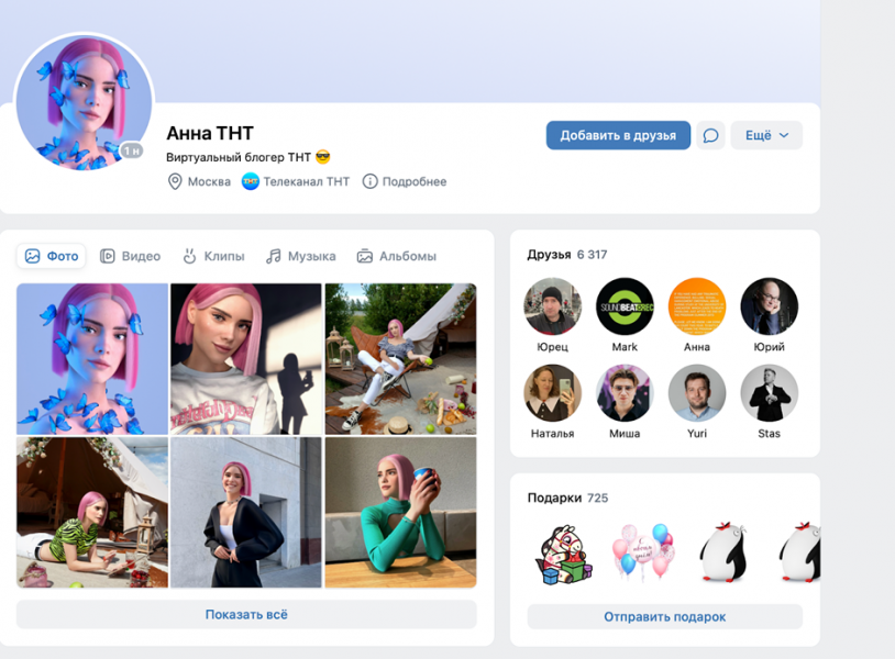 К виртуальным персонажам обращались и медиакомпании: у телеканала ТНТ появился собственный цифровой блогер — Анна ТНТ, у которой во «ВКонтакте» было около 6,3 тысяч друзей и 7,9 тысяч подписчиков, хотя активность в аккаунте прекратилась осенью 2022 года.