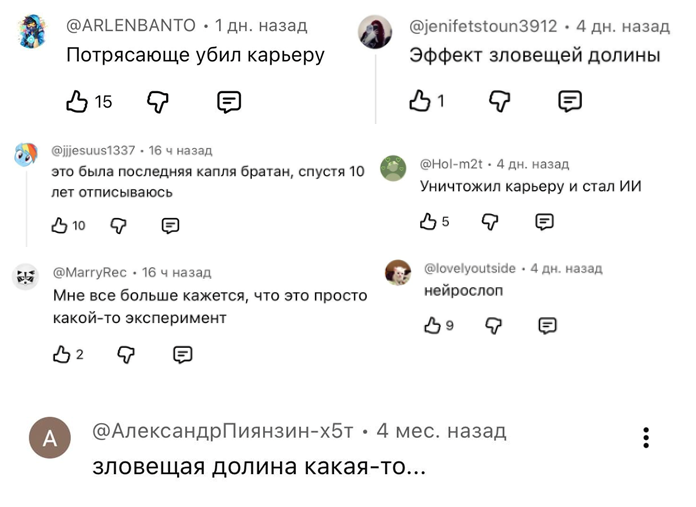 Анализ комментариев под контентом ИИ-инфлюенсеров показывает, что негатив чаще направлен на саму природу формата. Пользователи отмечают, что в таком контенте теряется творческая работа живого человека. Основные темы критики в комментариях сводятся к нескольким повторяющимся мотивам: