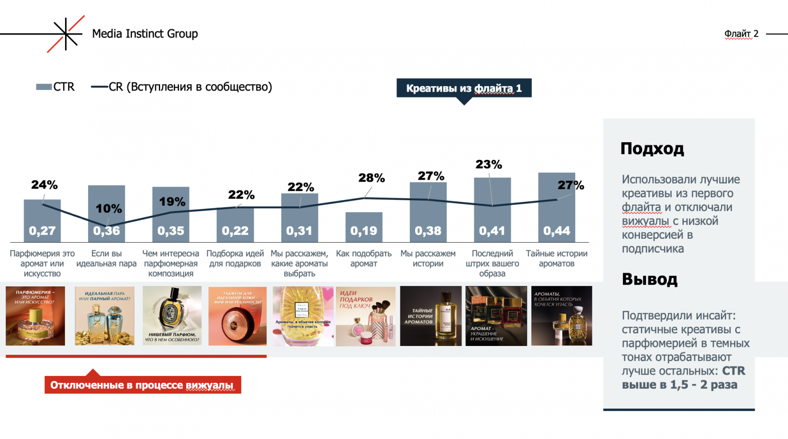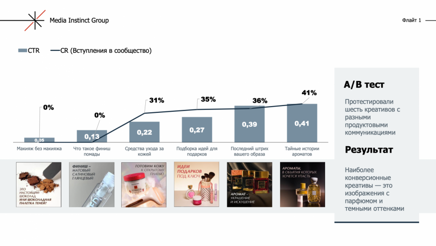 Команда запустила второй флайт через две недели после первого, он работал один месяц. Для размещения она взяла три креатива из первого флайта с наиболее высокими показателями по конверсии в подписчика, а также добавила к размещению еще шесть креативов. Они отличались друг от друга текстами, визуалами и форматами. Для части креативов агентство использовало статичные изображения, для другой — видео. В ходе кампании команда Media Instinct Group отключала неэффективные варианты. Подтвердился вывод, что статические креативы с парфюмерией в темных тонах отрабатывают лучше остальных: CTR по ним выше в 1,5−2 раза, CR в подписчика выше средних значений.