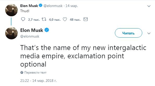 Слухи об интересе Маска к медиа ходят уже давно. Ранее СМИ сообщали, что несколько сотрудников сатирического издания The Onion перешли в секретный творческий проект, который готовит к запуску создатель SpaceX и Tesla. По неофициальной информации, речь идет о бывшем главреде The Onion Коуле Болтоне и ответственном редакторе Бене Беркли, которые уволились в конце прошлого года. В марте 2018 года Маск анонсировал создание «межгалактической медиаимперии».