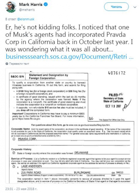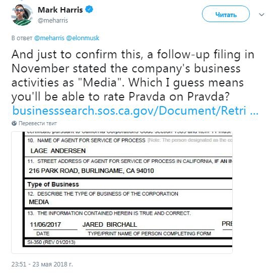 Журналист Марк Харрис обратил внимание на то, что структуры бизнесмена действительно зарегистрировали компанию Pravda Corp. в Калифорнии. Ее сферой деятельности заявлены «Медиа». Регистрация была произведена в октябре 2017 года.