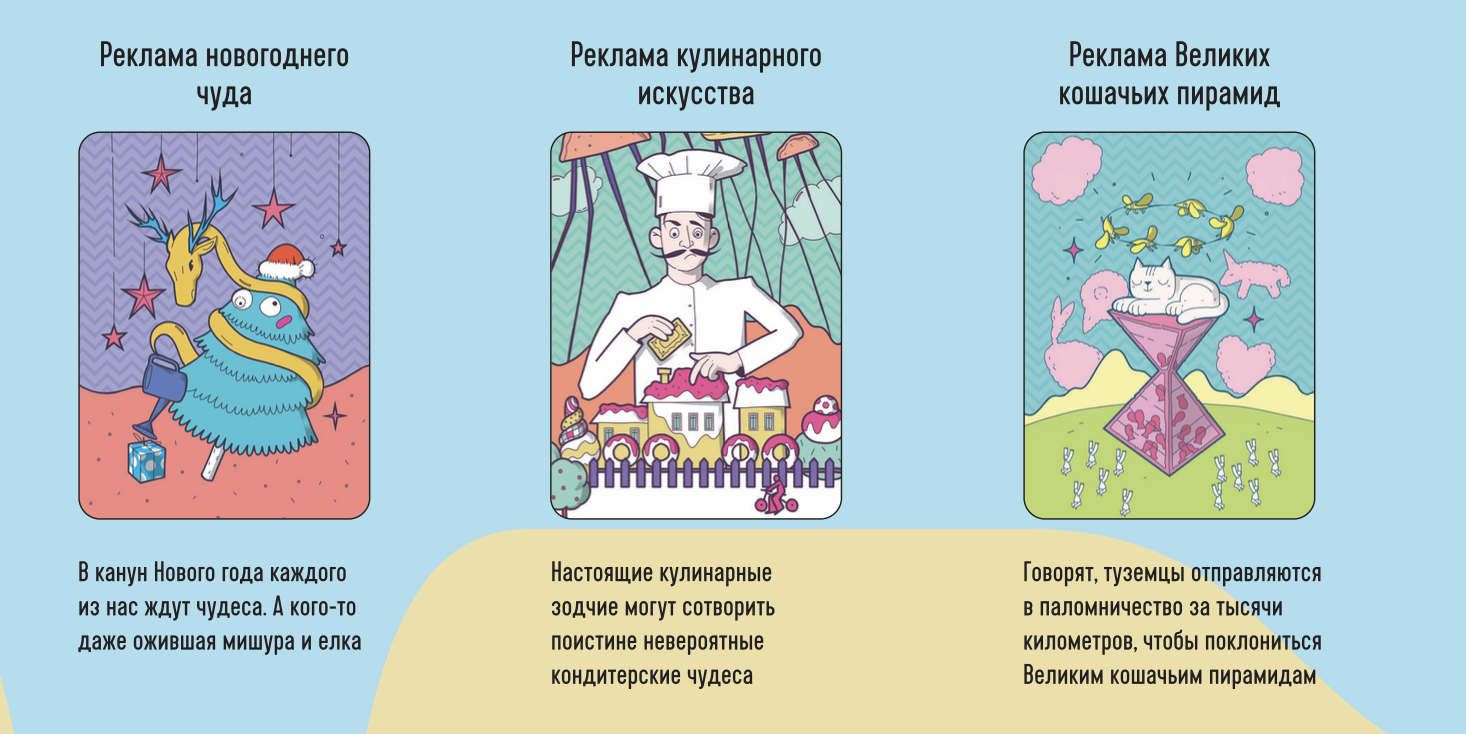 Вдохновившись телевидением из «Рика и Морти», мы придумали большую идею, которая всем понравилась и в итоге легла в основу для дальнейшего креатива — мультивселенная рекламы. Спойлер алерт: среди наших карточек можно найти Мона Лизу с белоснежной улыбкой и упаковкой зубной пасты в руках, Стива Джобса и подорожник — остальное ищите сами. Как итог, мы объединились и сделали классный проект, чтобы вы могли наслаждаться новыми рекламными мирами, качественными иллюстрациями и развивать своё воображение.