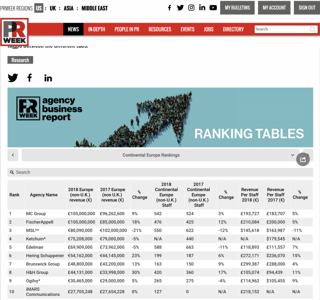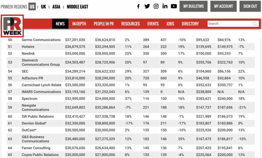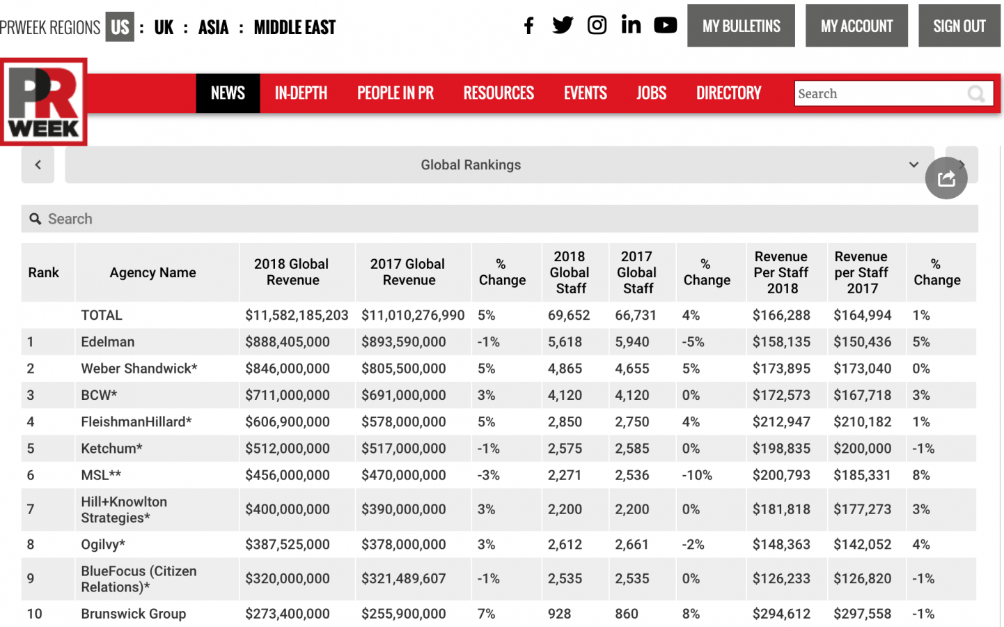 Ведущее международное издание в области PR-индустрии PRWeek со штаб квартирой в Нью-Йорке (США) опубликовало PRWeek Agency Business Report 2019, ежегодный авторитетный рейтинг крупнейших игроков коммуникационного рынка мира).
