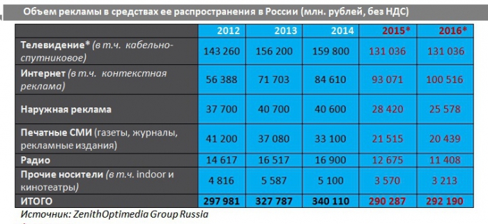Согласно прогнозу ZO, телевидение (в том числе кабельно-спутниковое) в 2015 года снизит объем размещенных рекламных средств на 18%, а в 2016 году её ждет нулевая динамика. Это значит, что крупнейший рекламный сегмент ждет стагнация при сохранении текущей экономической и политической ситуации.