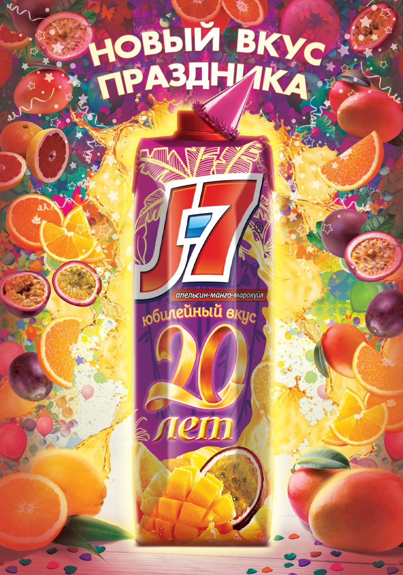 Команда компании PepsiCo создала креативную концепцию ролика для сокового бренда J7 компании Pepsico, который в этом году отмечает 20-летний юбилей и приглашает всех присоединиться к празднику.