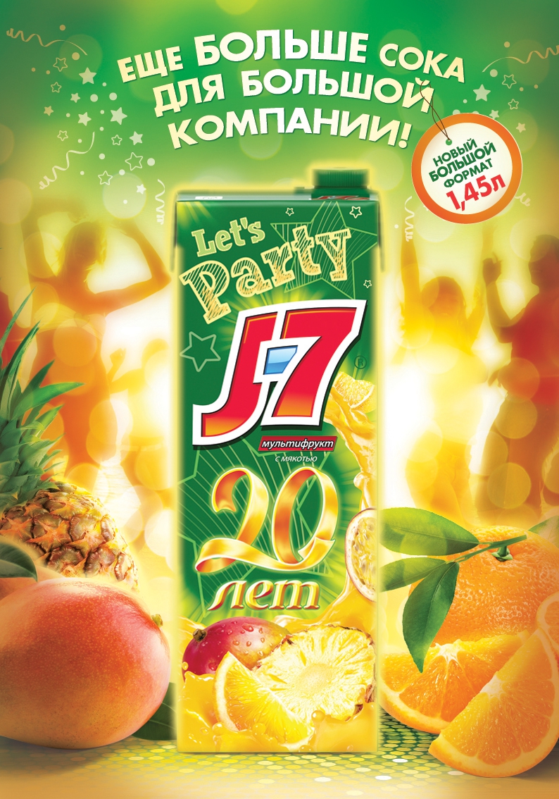 «Юбилейный 2014 год будет наполнен множеством приятных подарков и сюрпризов, среди которых запуск нового юбилейного вкуса «Апельсин-манго-маракуйя» и появление новой праздничной упаковки Party Pack (1,45л). Празднования уже начались на «Острове Счастья J7», где 180 победителей нашей промо-акции провели 7 «сочных» дней в компании с любимым брендом», – рассказывает директор по маркетингу категории соков компании PepsiCo Евгений Капустин.
